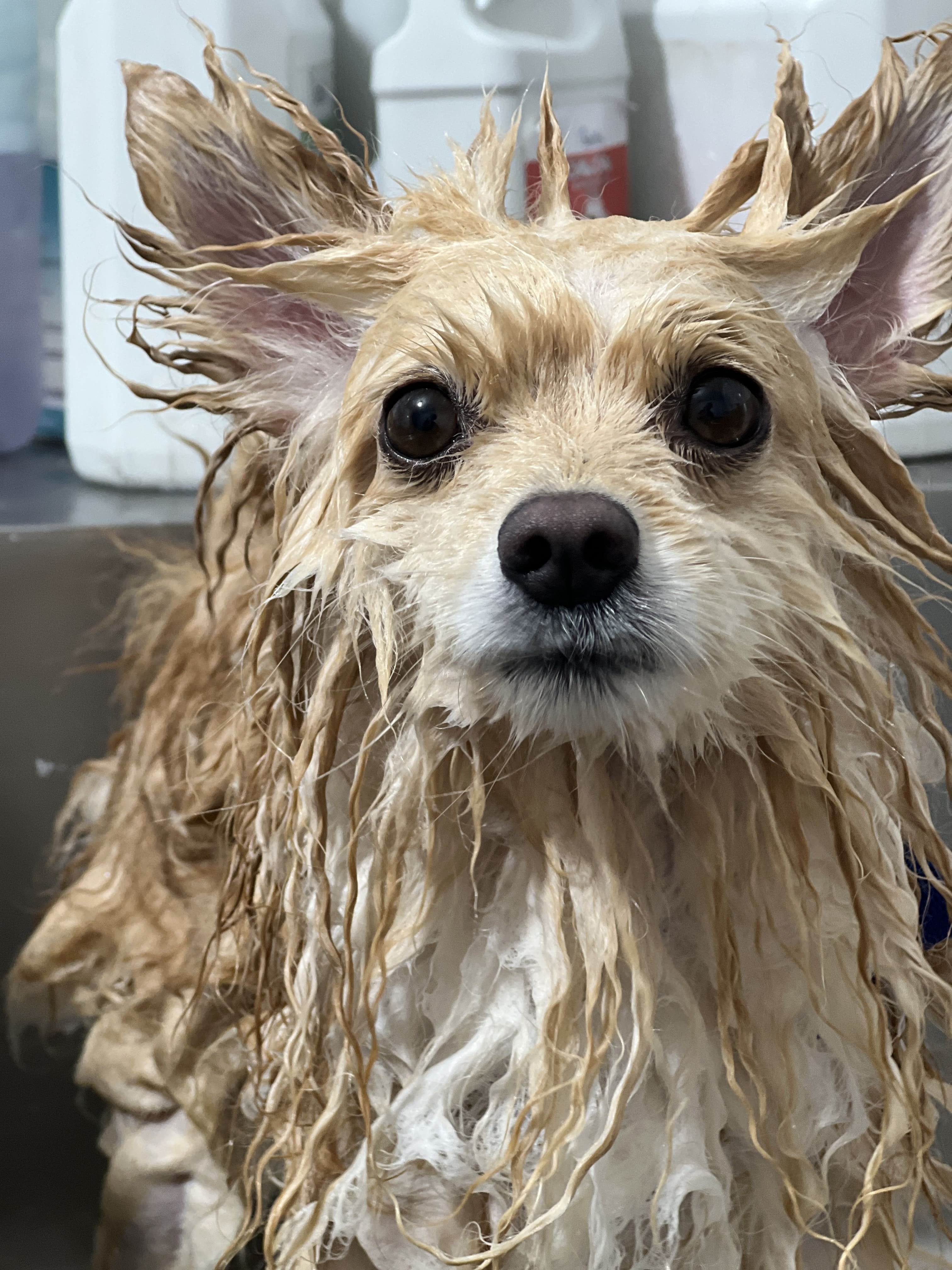 pasamos a la tina, utilizando algodon para tapar sus oidos y aplicamos agua, depsues champu desengrasante para elimiar toda clase de suciedad. enjuagamos y sacamos todo el champu. seguimos con el segundo champu que se utilizxara dependiendo de su estado, antipulgas, medica piel sencible, reducion caida pelaje etc, sacamos y enjuagamos.